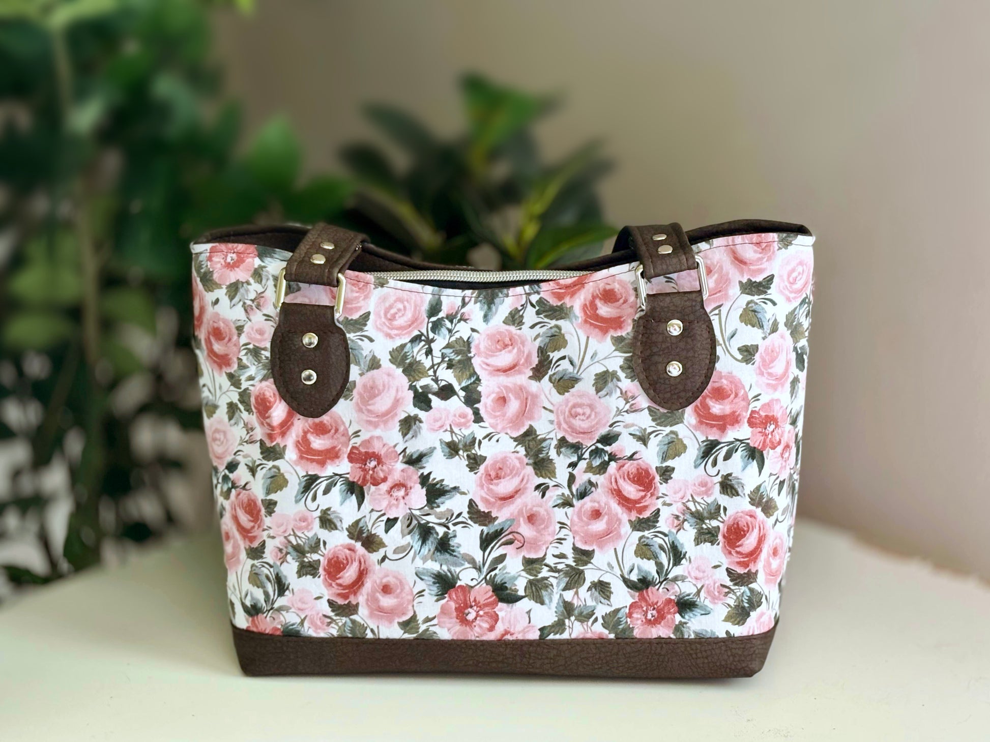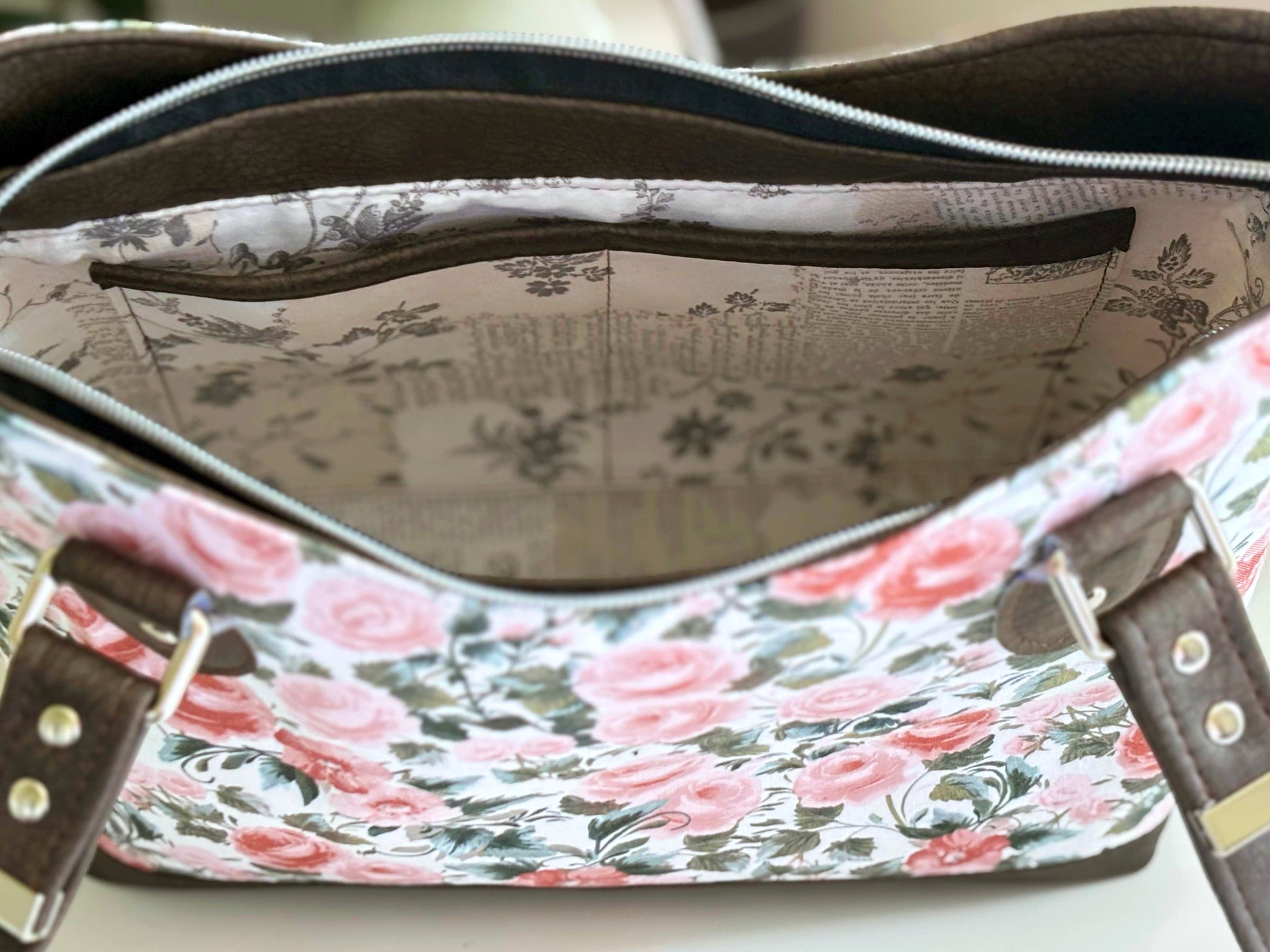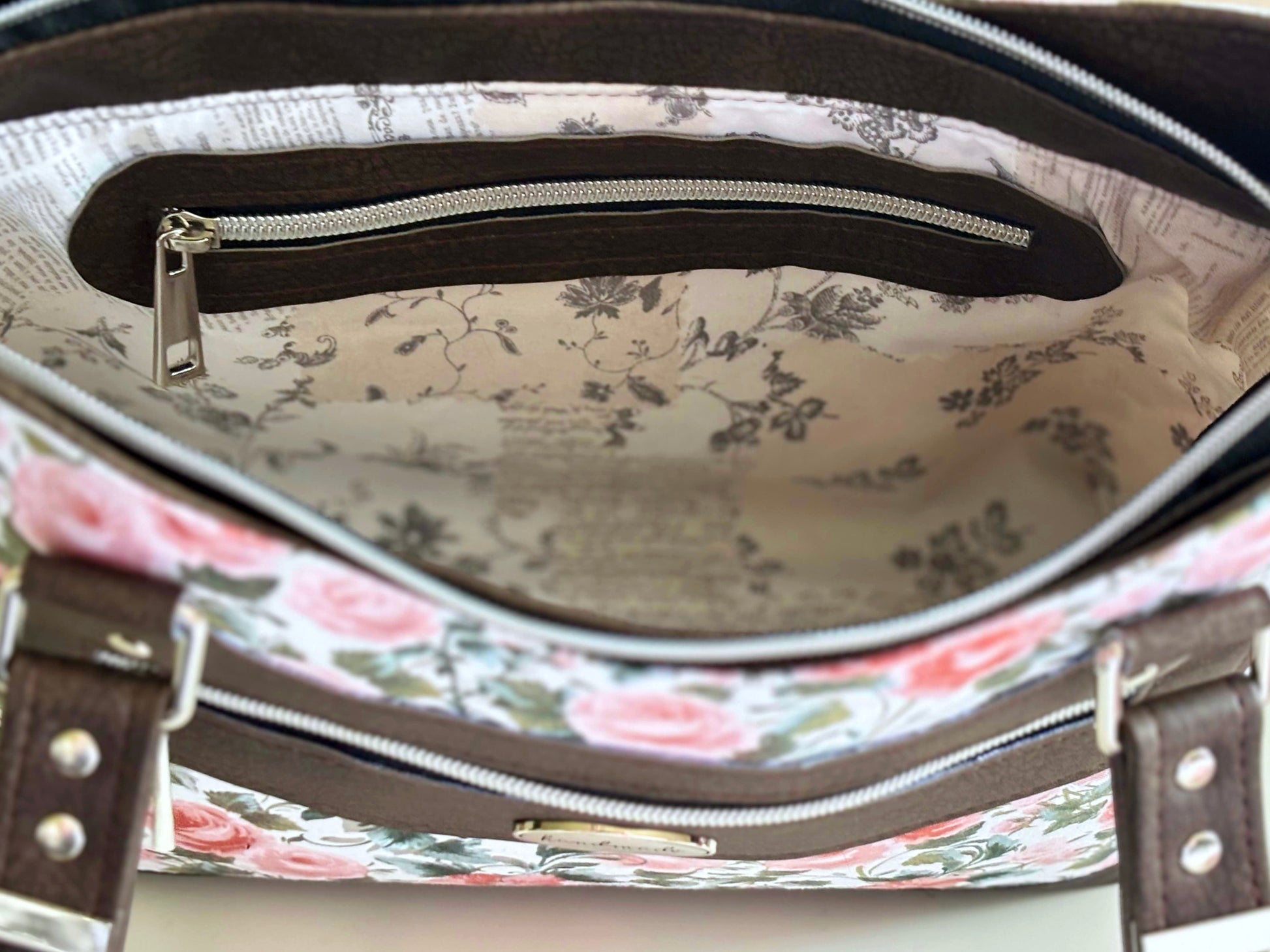 Amanda - Laura Jean She’s elegant, functional, and totally one-of-a-kind. Amanda features a lovely rose print paired with rich chocolate faux leather accents.